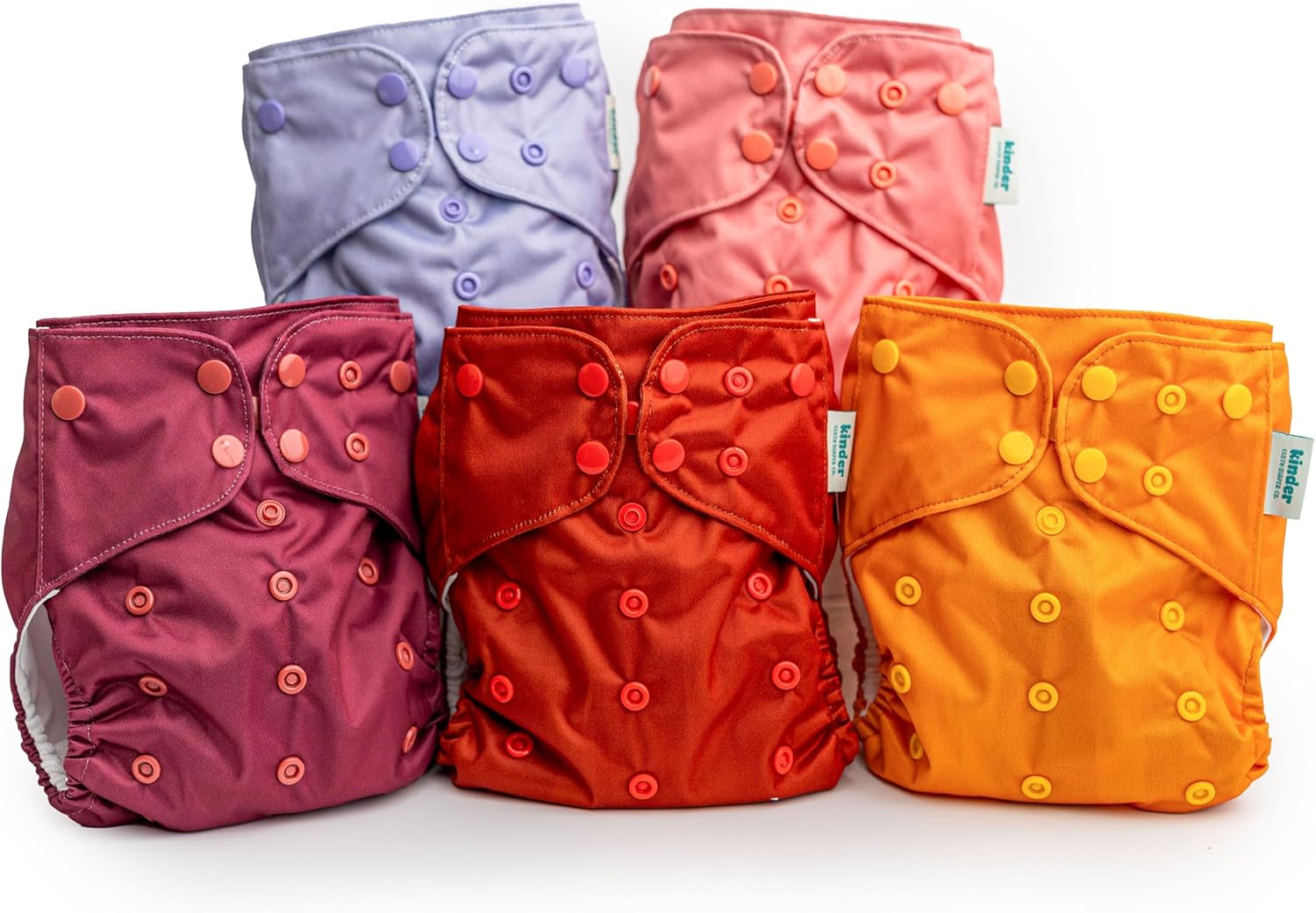 Kinder Cloth Diaper Co. Reusable Diaper Starter Bundles are designed to make the transition into reusable diapers a smooth one for all families. You’ll get a set of 5 of our best selling pocket cloth diaper outers, made of athletic wicking jersey for breathability and comfort. Take the stress out of cloth diapers with this beautiful pocket style cloth diaper set. Kinder’s modern, reusable pocket cloth diapers feature a three by five adjustable rise setting that is flexible enough to fit most babies from birth (7+ lbs) to potty training. Kinder diapers feature a soft breathable, athletic wicking jersey (AWJ) lining and waterproof tummy panel, ideal for tummy sleepers. The wide hip snaps and dirty crossover snaps allow for a more customized fit and our wide rear pocket elastic lays flat against babies back for a better overall fit and performance. All Kinder diapers also feature interior snaps that allow the option for our inserts to be snapped securely in place during use. Note inserts are NOT included in this set. What’s in the 5 Pocket Diaper outer bundle? – 5 Pocket Style Cloth Diaper Outers with Athletic Wicking Jersey Lining (Inserts sold separately)