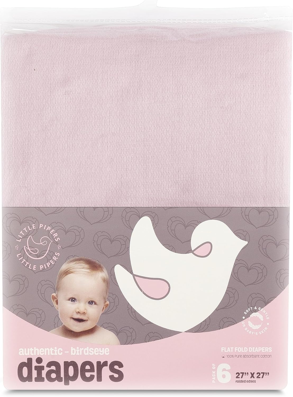 Little Pipers Deluxe 100% Natural Cotton Birdseye Cloth Diapers for Babies – Absorbent Cloth Diapers Burp Cloths – Pink – 6 Pack
