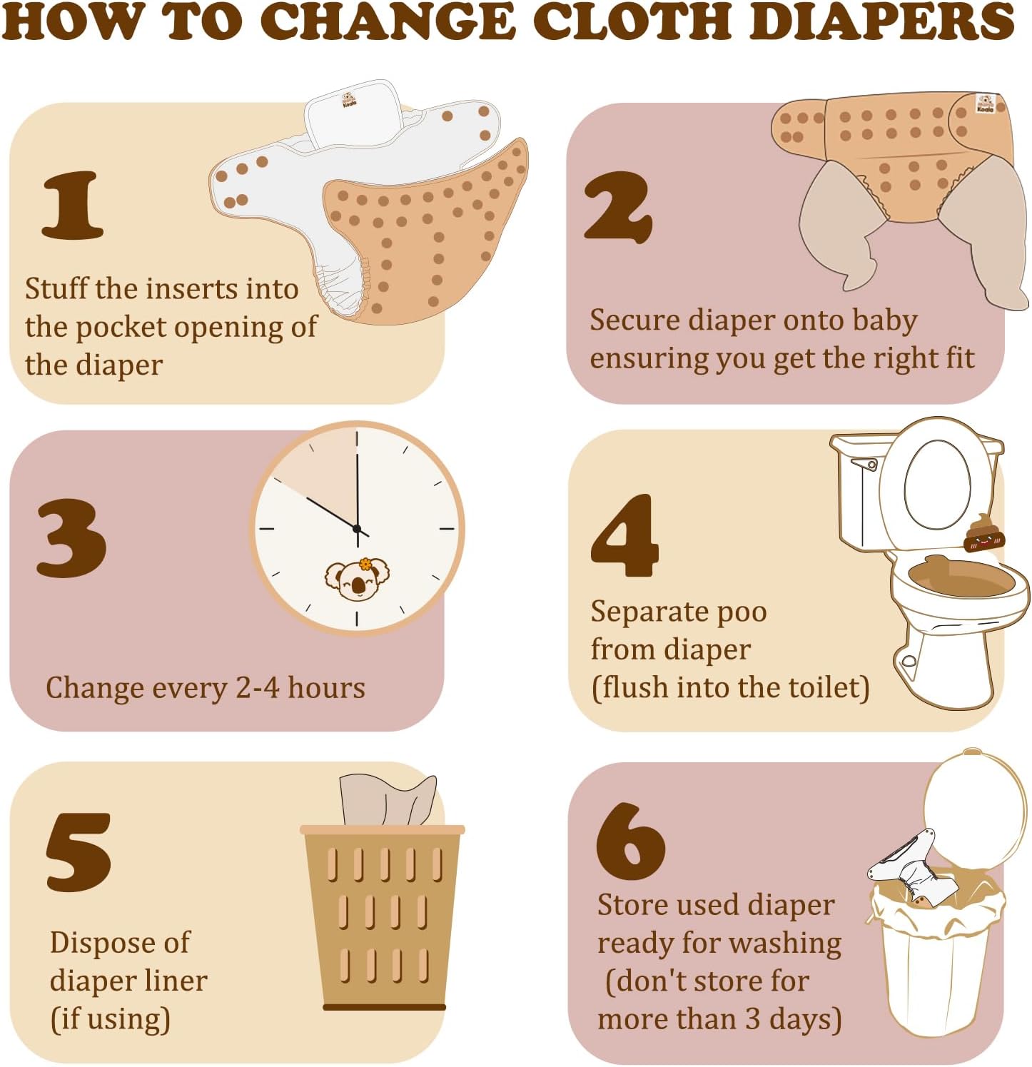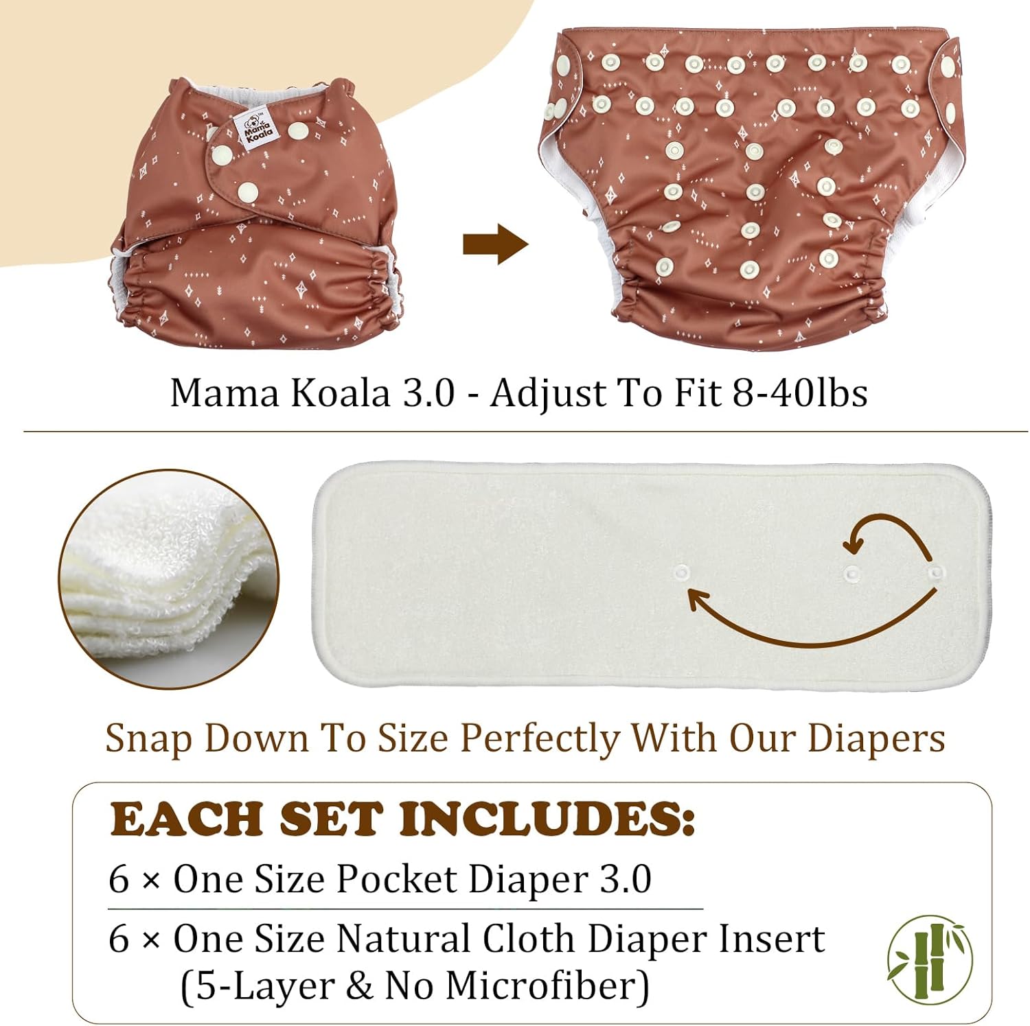 Mama Koala 3.0 Pocket Cloth Diapers for Babies with AWJ Lining, 6 Pack with 6 5-Layer Natural Cloth Diaper Inserts – Reusable and Washable Pocket Diapers(A-Wild Flowers)