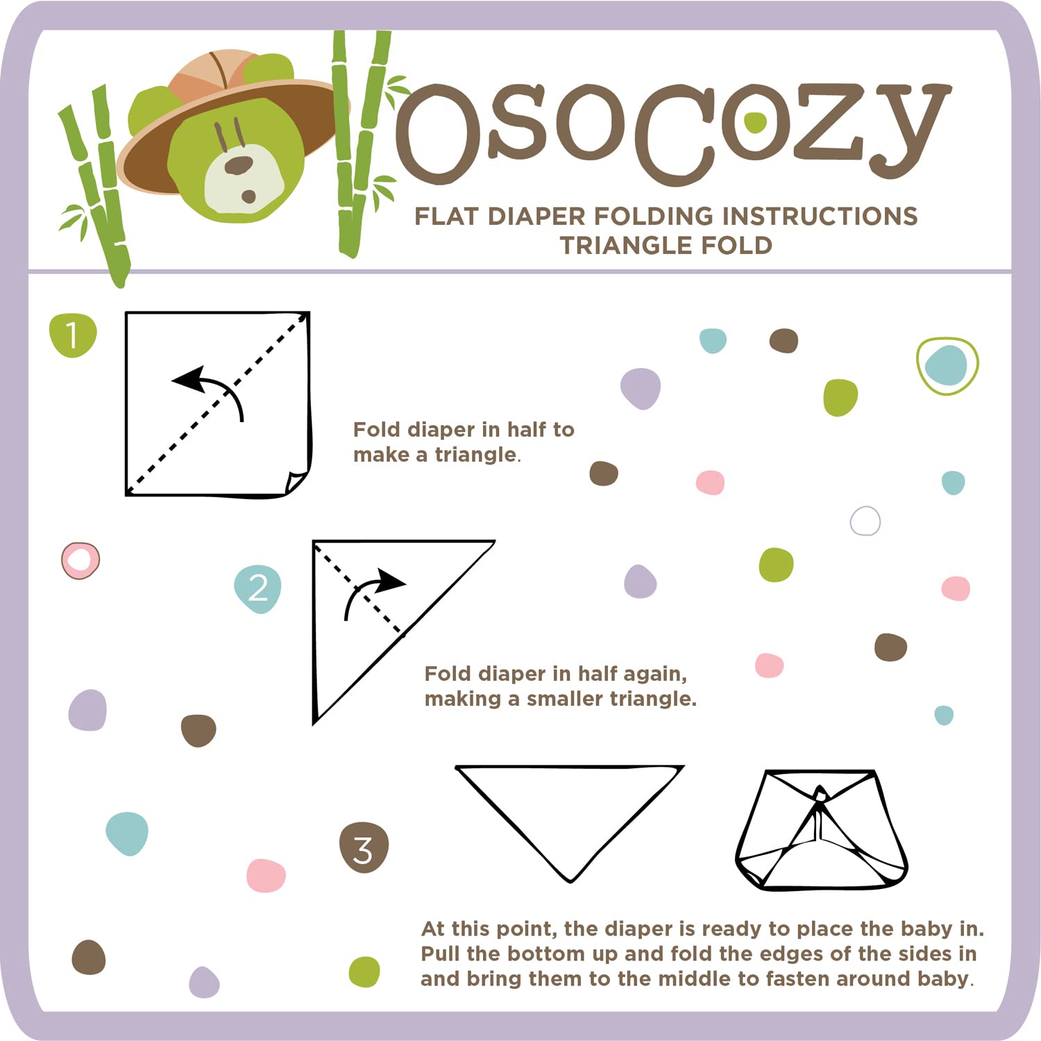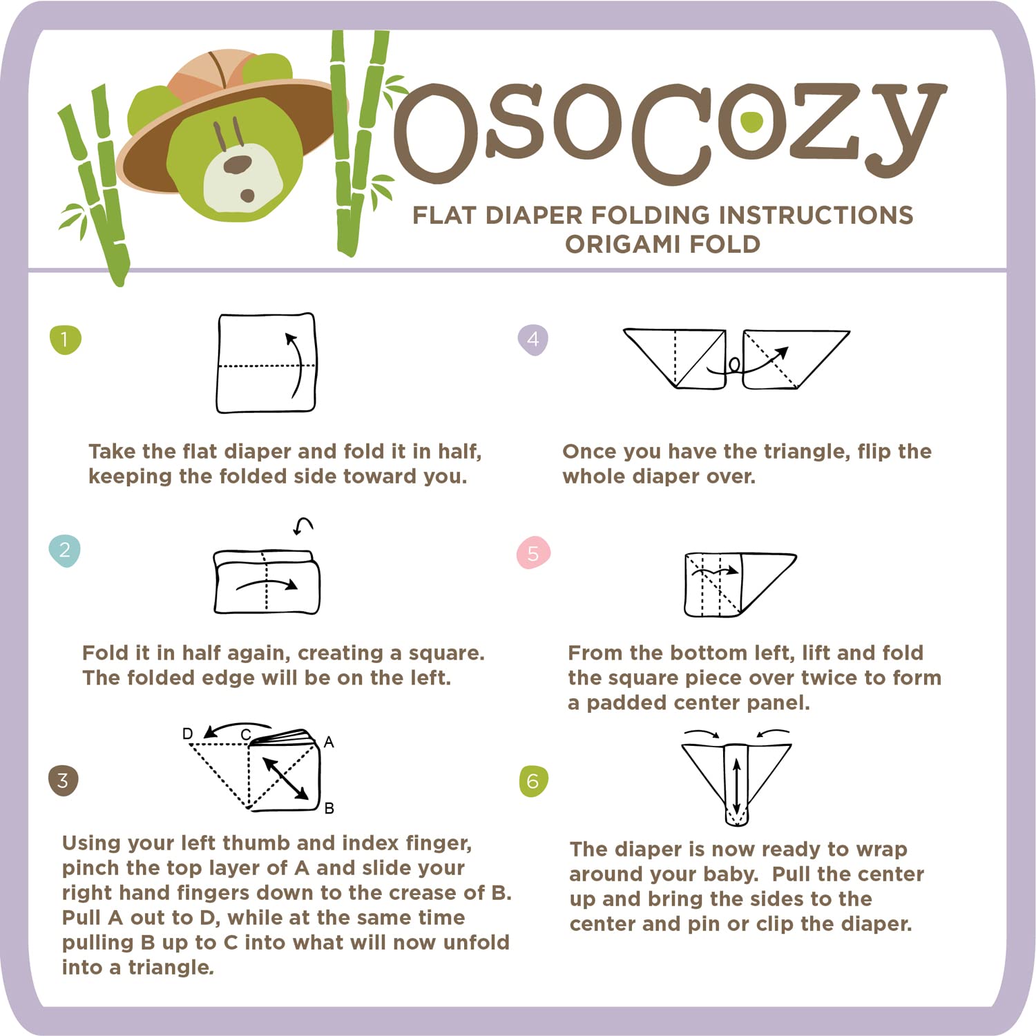 OsoCozy bamboo/organic cotton flat diapers are 70% bamboo and 30% certified organic cotton. They measure 32 inches by 35 inches (so they will shrink to square when washed), and they are one layer thick. Bamboo gives the diaper extra softness, while the added organic cotton makes the diaper sturdy and long lasting.